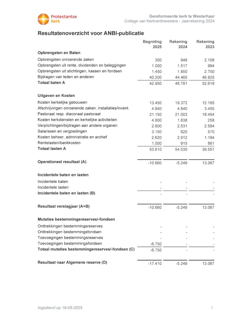 De Protestantse Kerk heeft van de Belastingdienst een groepsbeschikking ANBI gekregen. Dat wil zeggen dat de afzonderlijke gemeenten en andere instellingen die tot dit kerkgenootschap behoren zijn aangewezen als ANBI. Dit is ook van toepassing op de Gereformeerde kerk te Westerhaar-Vriezenveensewijk.